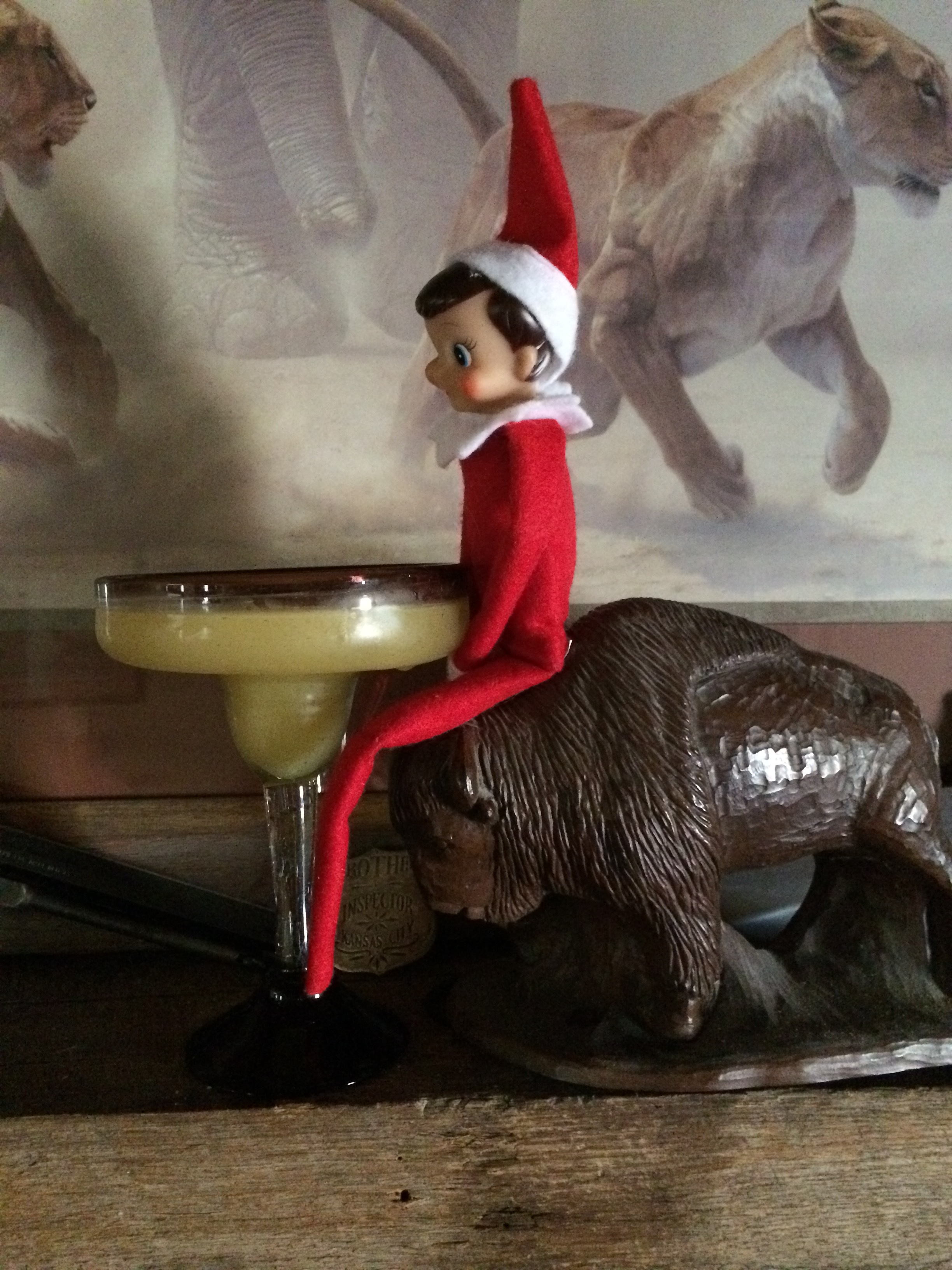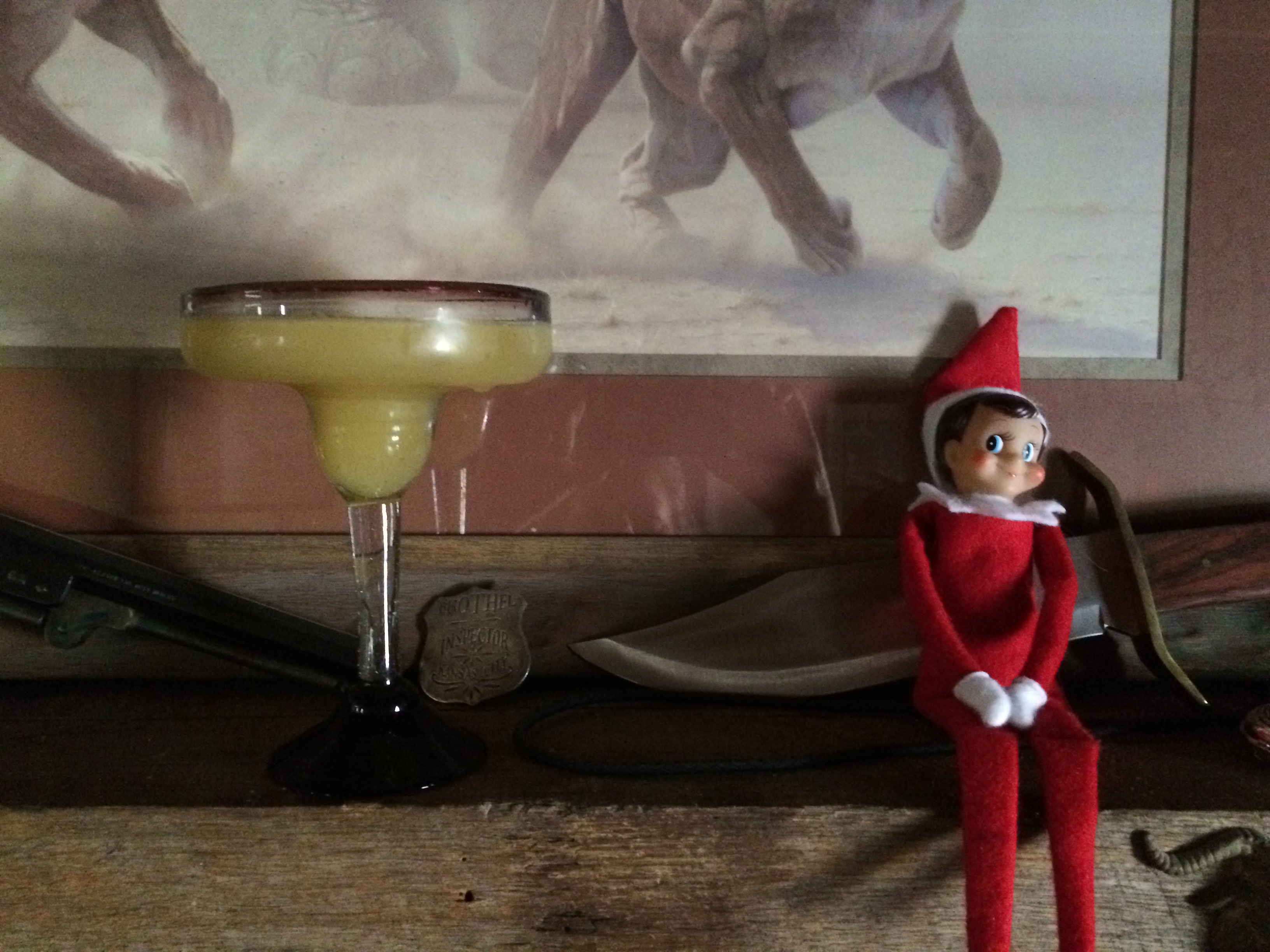 That damn Elf on the Shelf ~ I DID remember to move him almost every night this year.  But our Elf (no name…we don’t name things in our house) didn’t do any fancy, messy, crazy or creative things over night.  He barely got moved from one side of the room to the other.  The closest he came to doing anything unusual was when he fell out of the lamp shade and landed behind the couch.  THAT was weird because no one could see the little snot.  When we finally found him, I had to do some fancy footwork to move him to another spot, and make up a quick story about how he must have JUST flown in. So, next year, I’m thinking we might just skip Elf on the Shelf, and go with “Margarita on the Mantel” instead.  I KNOW for a fact that I’d move THAT every night.  Heck, I might even move TWO.